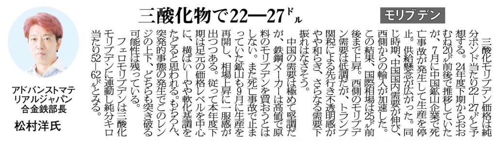 Hiroshi Matsumura, General Manager of Ferroalloy Department contributed an article on molybdenum on page 12 of Daily Japan Metal Bulletin issued on 16th Oct 2025 (in Japanese). Mo