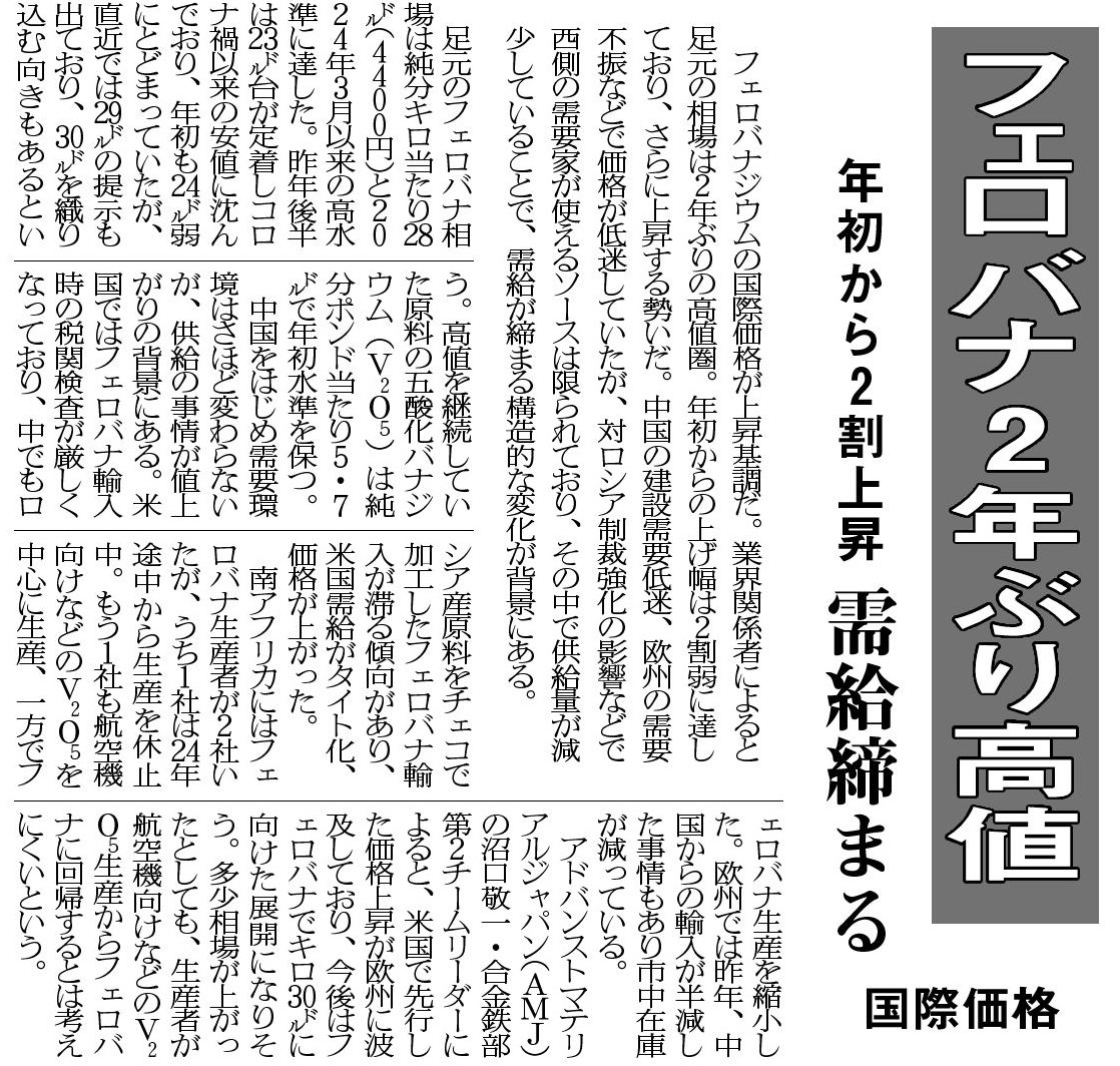 2026年3月5日付 日刊産業新聞 2面のバナジウムの記事に弊社 沼口敬一 のコメントが掲載されました。V