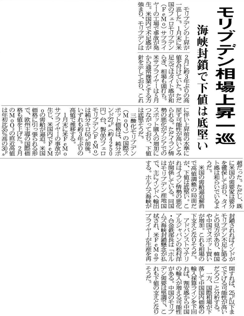 2026年3月5日付 日刊産業新聞 12面のモリブデンの記事に弊社 合金鉄部長 松村洋 のコメントが掲載されました。Mo