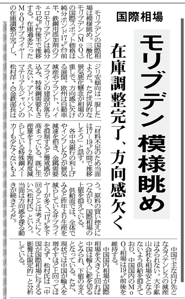 Hiroshi Matsumura, General Manager of Ferroalloy Department made comments on molybdenum to an article on the 11th page of Daily Japan Metal Bulletin issued on 27 Jun 2022 (in Japanese). Mo